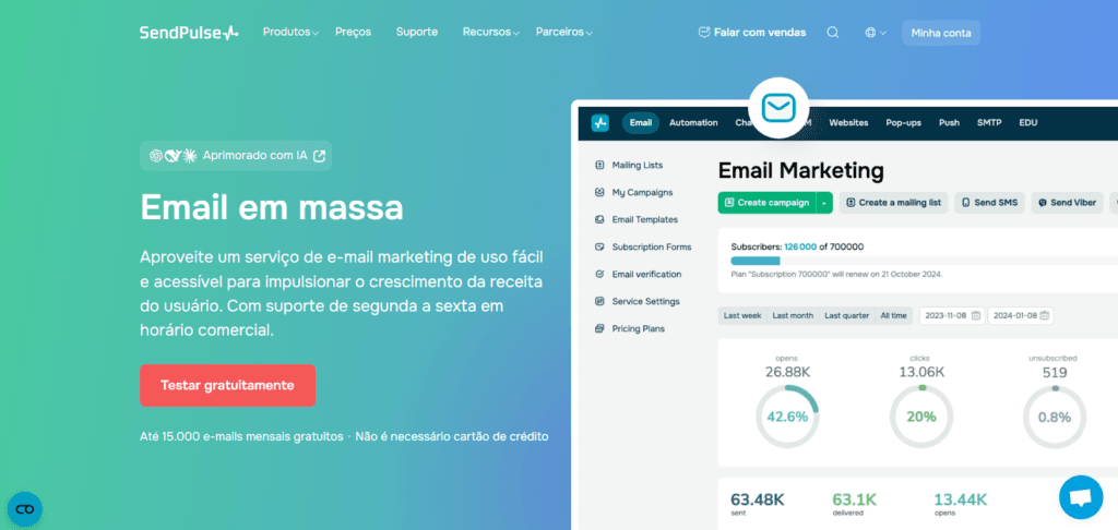 Página de serviço de e-mail marketing da SendPulse